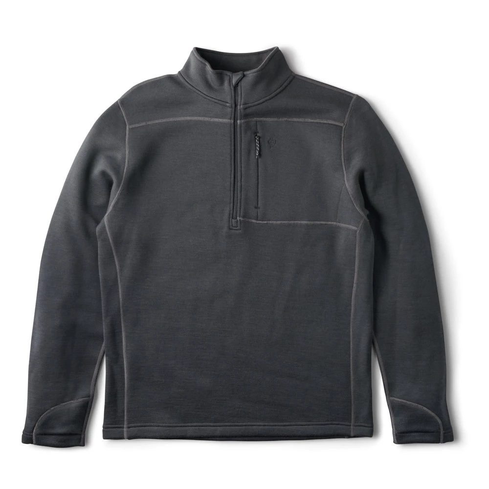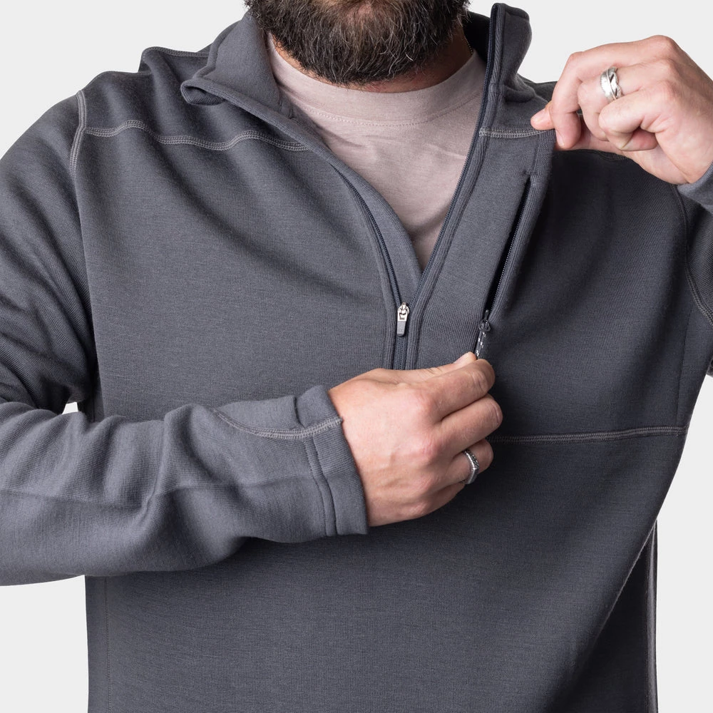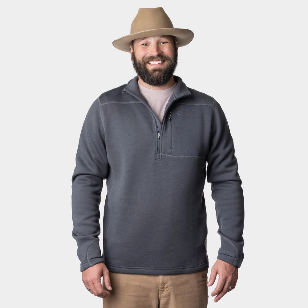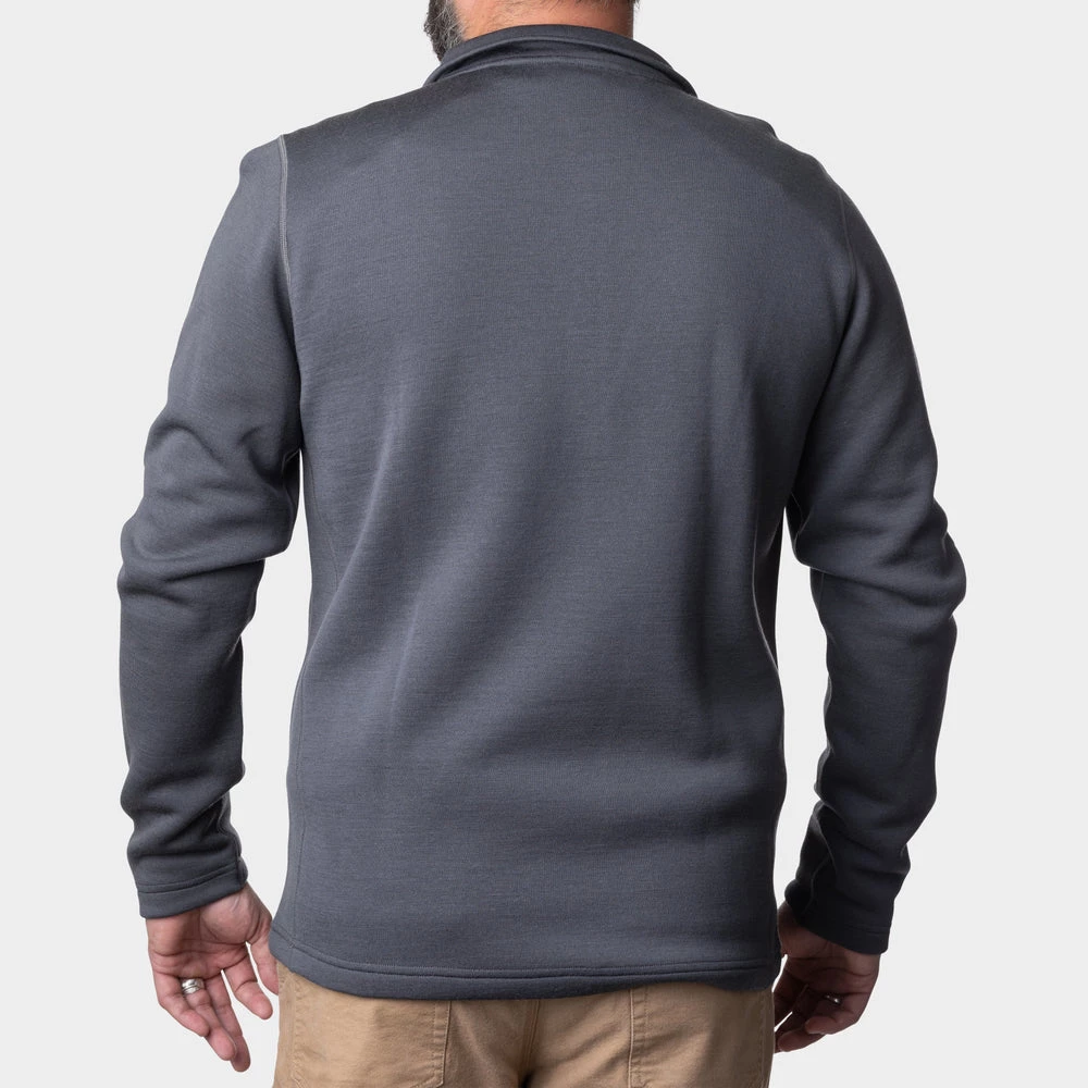 A sharp looking and high performing piece, this well-rounded Merino 1/4 zip wears comfortably from temperature ranges 30 degrees to 70 degrees. It features a soft brushed fleece next-to-skin layer, thumb holes for easy layering and warmth, flat locked seams and a heavy weight construction for ultimate comfort as a mid or outer layer. The Merino Wool advantage is real: this garment regulates your body temperature and doesn’t run too hot as temperatures rise later in the day.