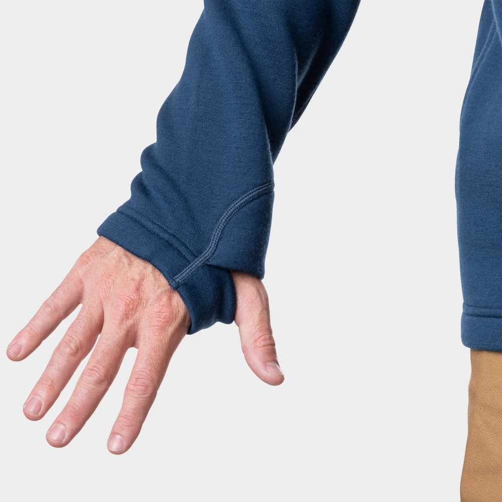 A sharp looking and high performing piece, this well-rounded Merinoย 1/4 zipย wears comfortably from temperature ranges 30 degrees to 70 degrees. It features a soft brushed fleece next-to-skin layer, thumb holes for easy layering and warmth, flat locked seams and a heavy weight construction for ultimate comfort as a mid or outer layer. The Merino Wool advantage is real: this garment regulates your body temperature and doesnโt run too hot as temperatures rise later in the day.