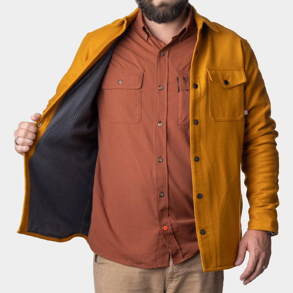 Warmer than a 4am cup of gas station coffee, our Campfire Shacket is along for the ride. With a cozy flannel exterior and soft grid-fleece lining, this is the perfect way to get a little more comfortable for those early morning drives and post-hunt drinks.