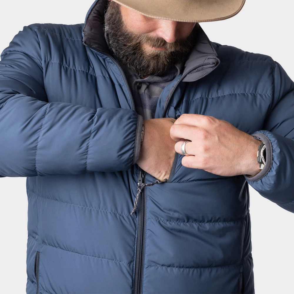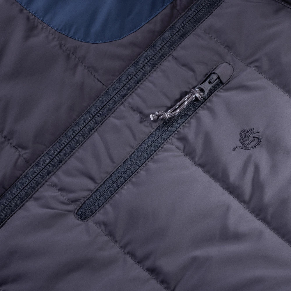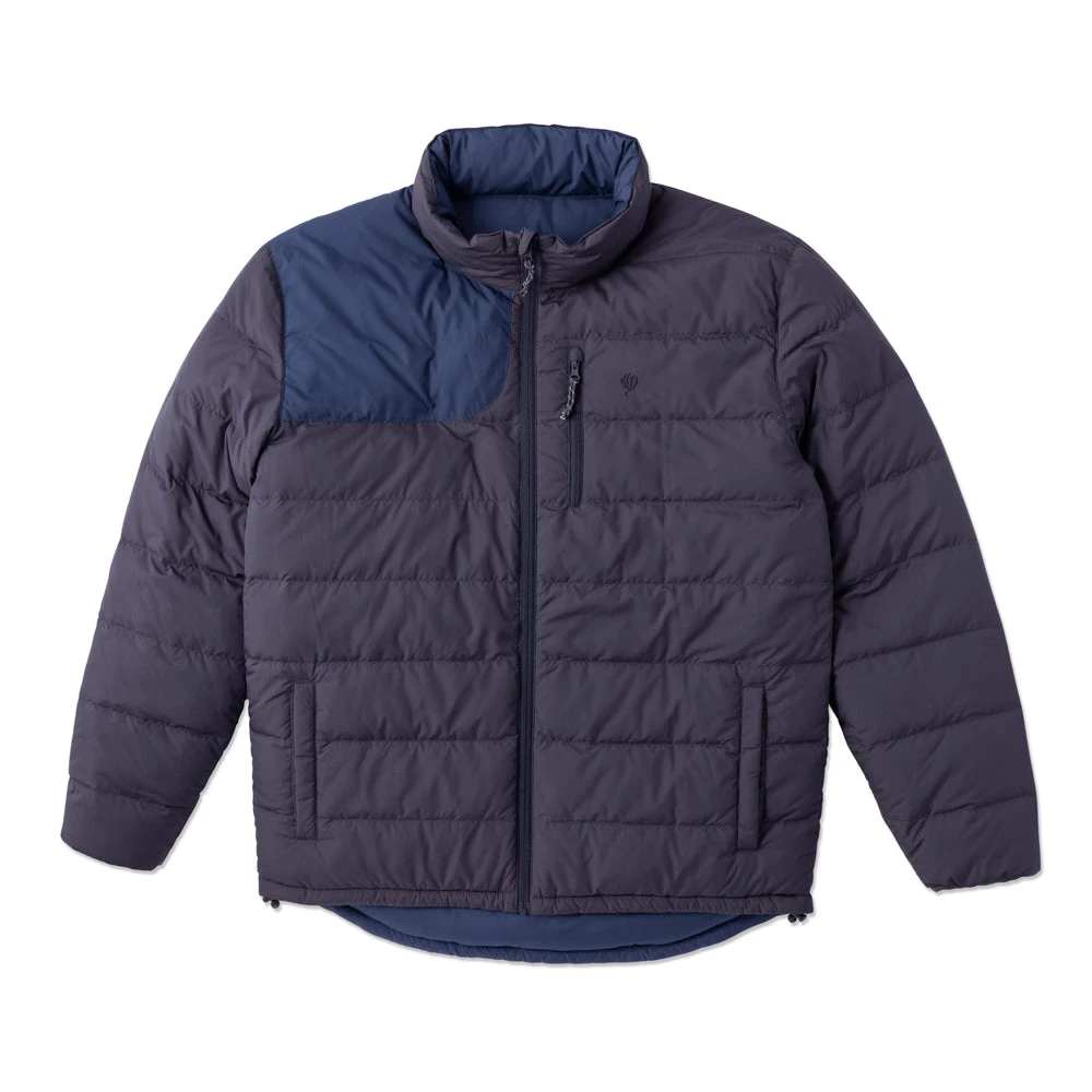 One ultra warm jacket, two different looks. This reversible down jacket features two colors, charcoal and faded navy, and is lightweight, packable, and water resistant.