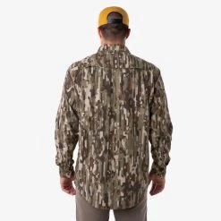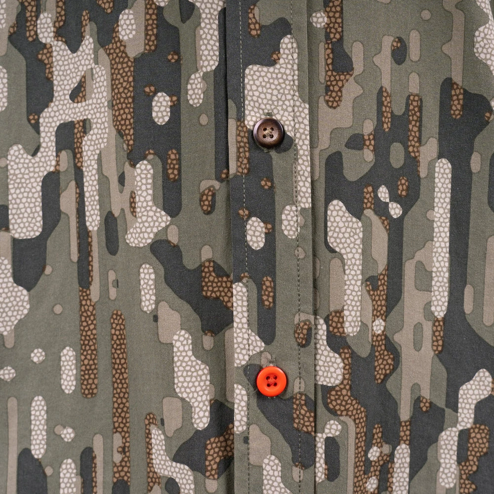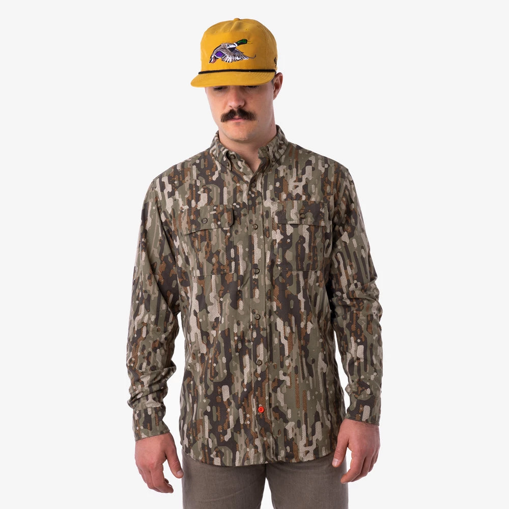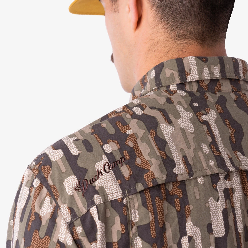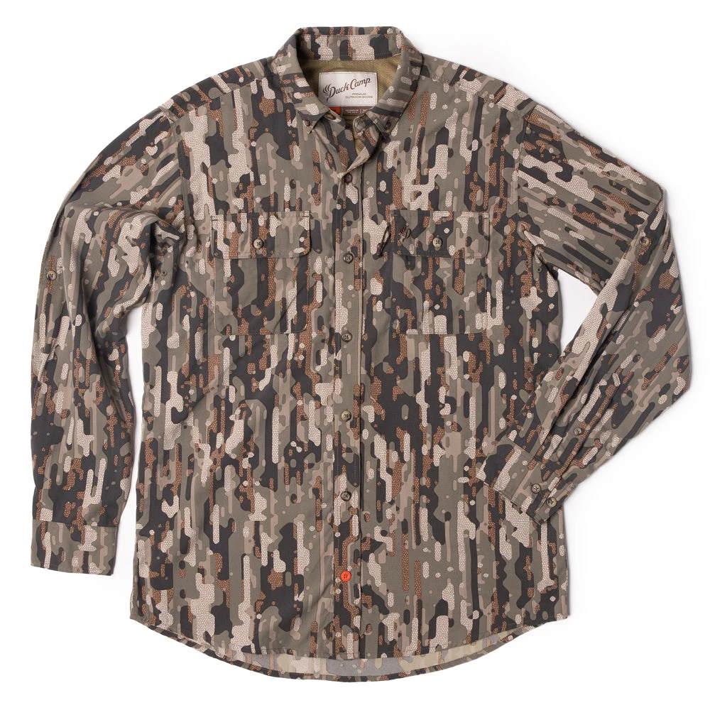 Built for the whitetail woods, turkey trees or any wooded environment, Duck Camp Woodland camouflage is a new staple pattern for year-round wear. This Lightweight Hunting shirt will keep you cool and concealed for early season deer hunting or warmer days in the flooded timber. This button down hunting shirt has a traditional look with modern features like a hidden zipper pocket and mesh back venting. Snag this shirt for your early season hunting adventures.