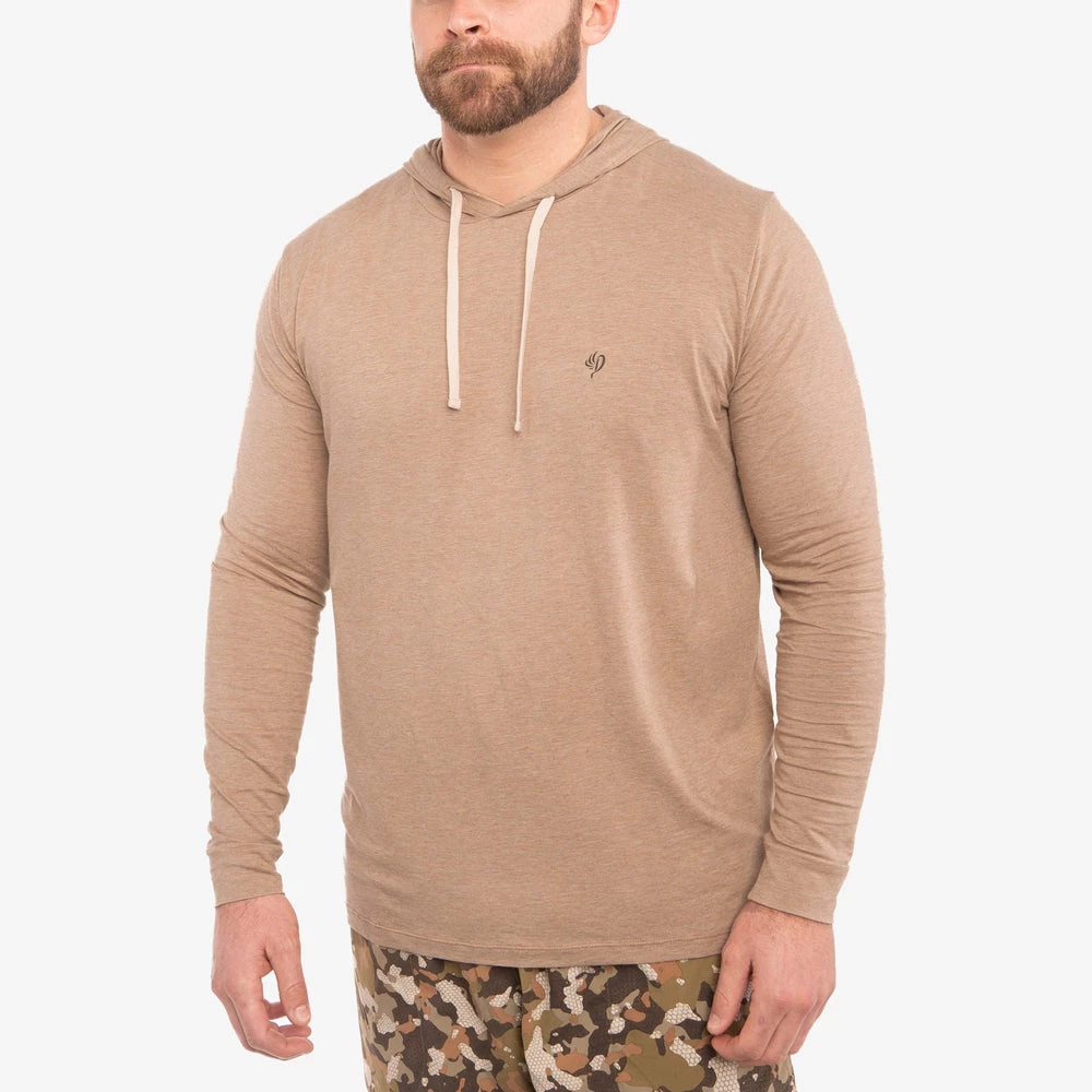Bamboo is a true super fabric. This Bamboo/Cotton blend hoodie is super versatile. Itโs great in warm weather, but also substantial enough to keep you warm as a base in the fall/winter. The bamboo fabric is naturally odor resistant and moisture wicking, which makes for one of the best outdoor shirts on the market today. Whether youโre bass fishing, hiking, canoeing, hunting, or simply cooking in the backyard, this shirt is sure to be a favorite. Use your hood and donโt worry about forgetting the sunscreen!